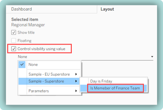- Checking the Control visibility using value checkbox in the dashboard pane