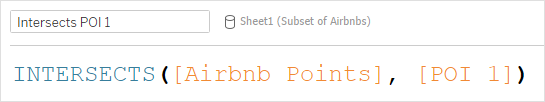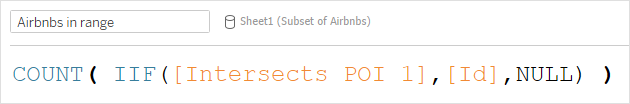 The following calculation returns a count of the number of Airbnb IDs of those that intersect with the buffer object.