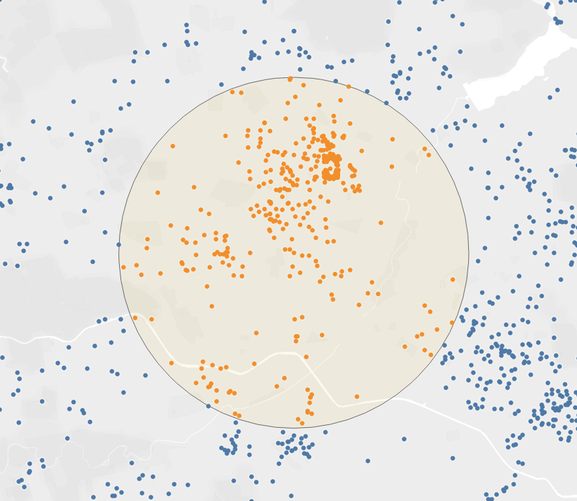 The buffer size is controlled with a parameter. When this is increased, we can see that the number of Airbnb locations colour encoded as intersecting the buffer object increases: