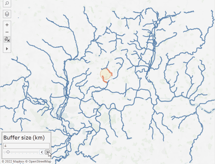 Again, changing the buffer size will alter which lines (waterways) the buffer intersects: